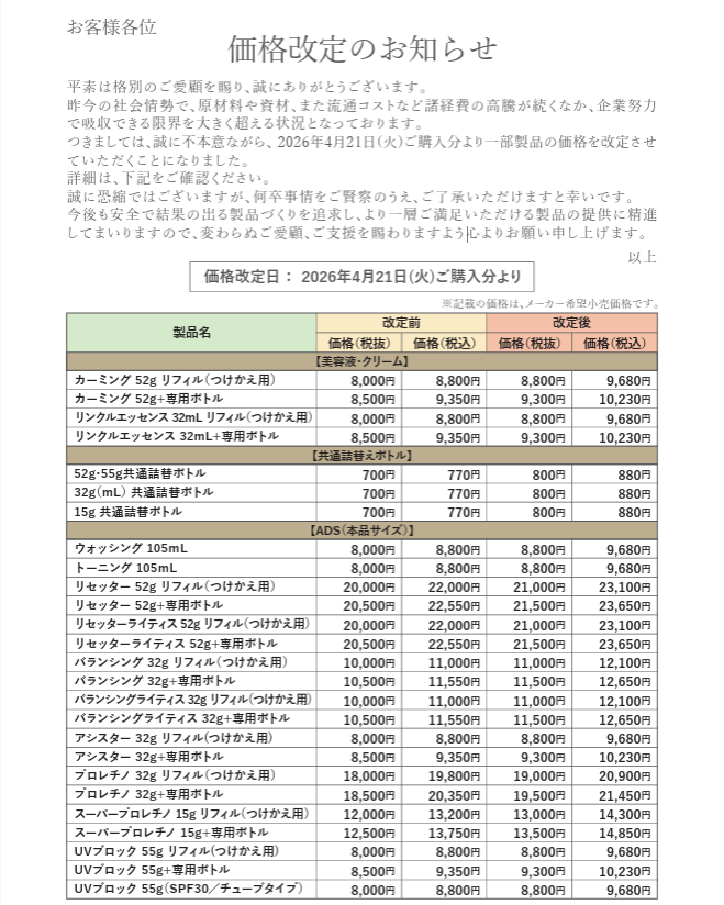 当オンラインショップでは、4月20日13時以降のご注文分より価格改定を実施させていただきます。
